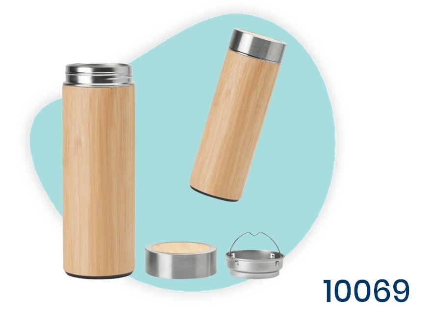Bouteille thermos double paroi Inox avec couvercle isolant, recouverte de bambou, d’une capacité de 400 ml, équipée d’un infuseur à thé.